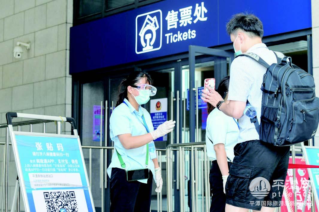 在平潭站進站口,工作人員查驗旅客的健康碼。融媒體記者 江信恒攝