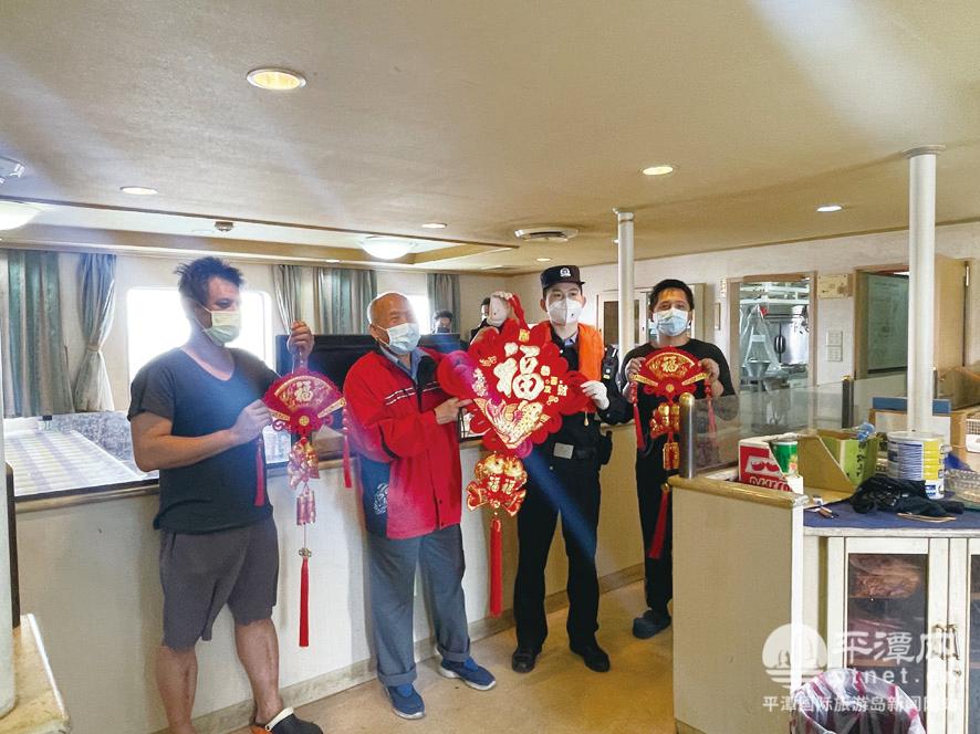 2023-01-17 09:54:34 來源:平潭網平潭網1月17日訊(融媒體記者 陳夢菲 文/攝 通訊員 陳清)“在春節前收到滿滿的祝福,非常高興。”昨日上午,滿載貨物的“臺北快輪”抵達平潭金井港區時,來自臺灣的船員們收到了平潭邊檢站民警送來的春聯、燈籠等,倍感溫暖。