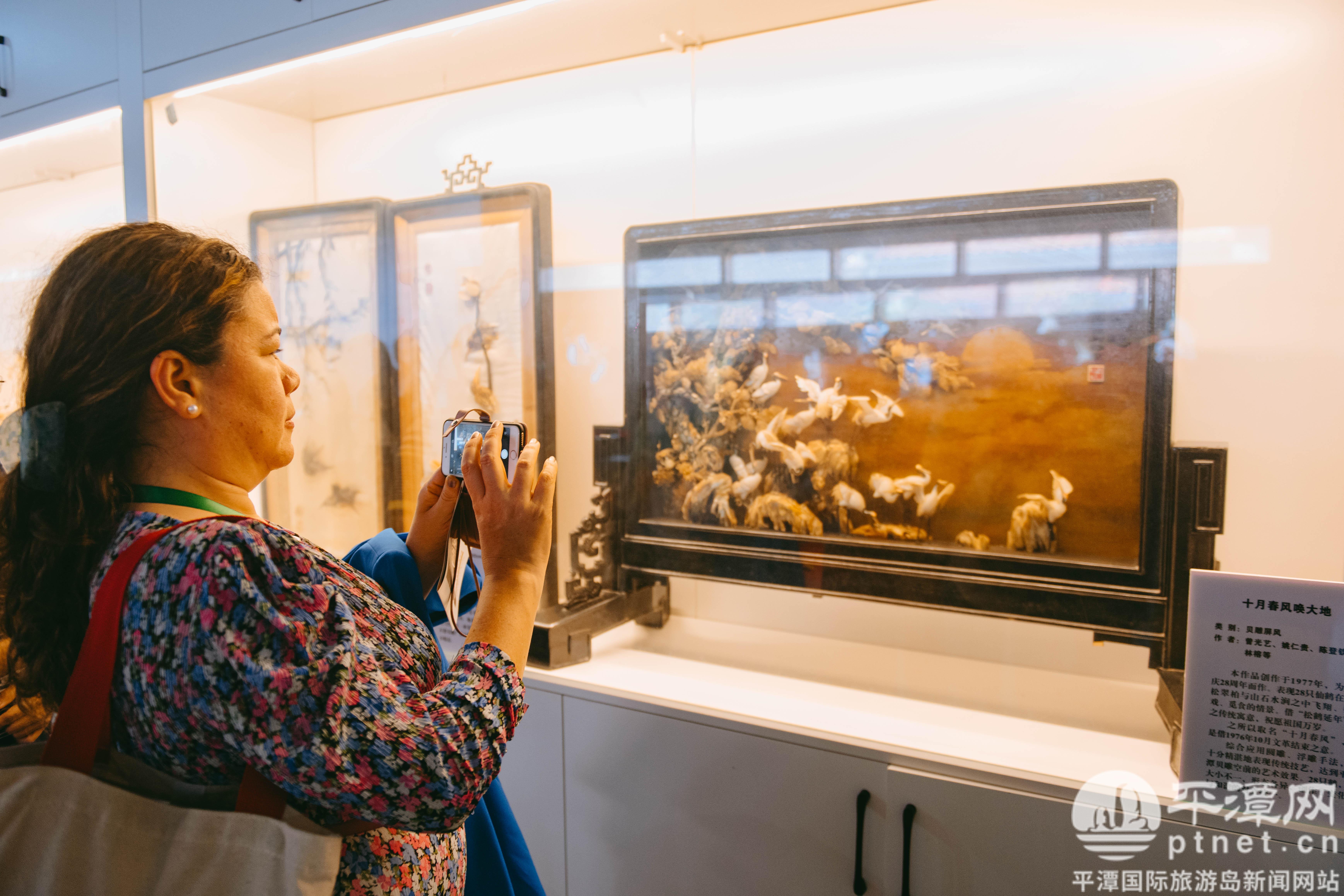 除了傳統(tǒng)貝雕工藝品,“中國傳世名畫貝雕再造”“貝雕+書畫”新式貝雕作品、“福文化”創(chuàng)意掛飾等展品,都讓國際友人們贊不絕口,參觀過程中,大家好奇地提問,拍照打卡,感受平潭非遺之美。