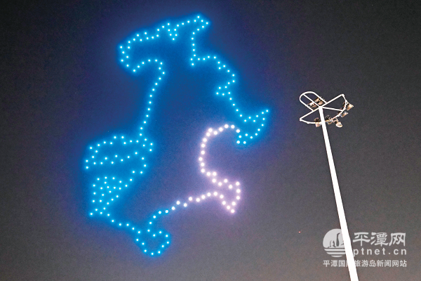當晚,無人機群從地面緩緩升空,以夜空為畫布,以燈光為畫筆,不停變換著各種陣型,賽車、風車、棒球、音符……隨著一個個光點在夜空中匯聚,平潭國際旅游島的浪漫、人文、活力被一一展現。