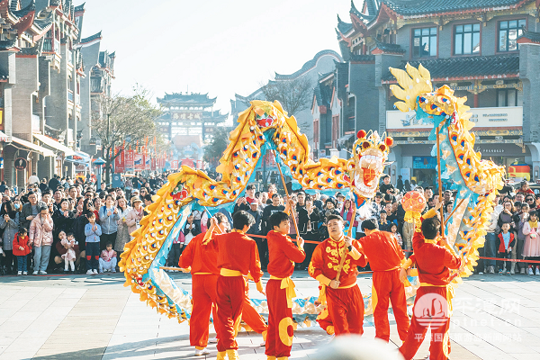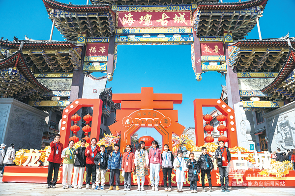 “兩岸民俗文化旅游節(jié)是從正月初一到正月十五,共持續(xù)15天時間?,F(xiàn)在我們位于兩岸民俗文化旅游節(jié)第一個打卡點。此處有兩條競技龍正在戲中間燈籠,寓意著龍年美好。再過一會,我們會欣賞到民俗歌舞巡演,感受民俗文化的魅力……”福建中輝文化旅游發(fā)展股份有限公司市場總監(jiān)鐘光森帶領(lǐng)小記者和家長們來到平潭海壇古城的入口,圍繞平潭海壇古城建筑風格、兩岸民俗文化旅游節(jié)特色等進行多方位、多角度講解。