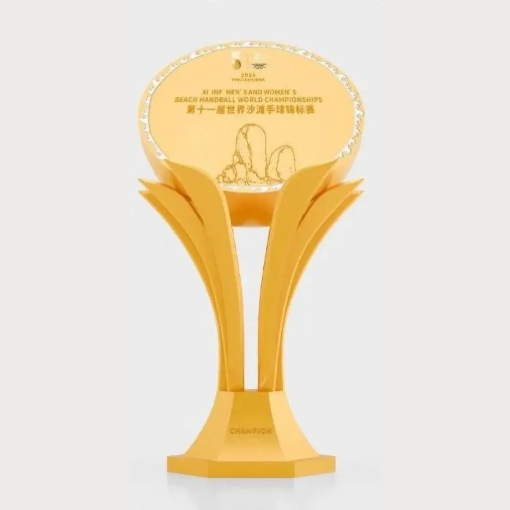 獎杯頂部,精心雕琢的沙灘手球剖面,不僅展現了這項運動的魅力核心,更創新性地融入了平潭地標——石牌洋的剪影,這一設計不僅讓獎杯更具地域特色,也將平潭的美麗景致深深印在每一位參賽者的心中。