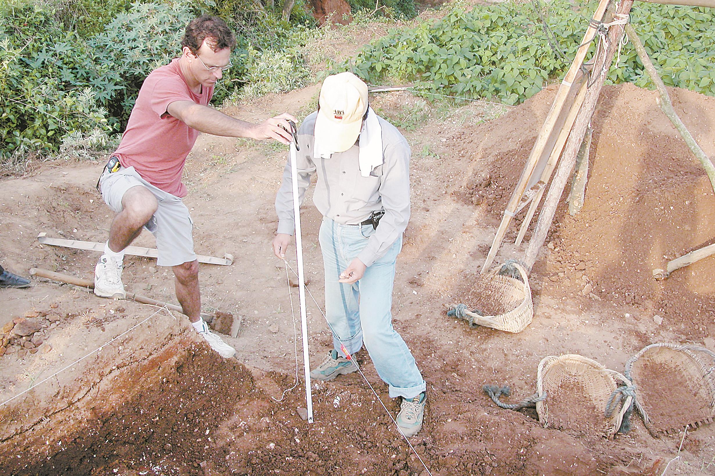2004年,羅萊(左)來到平潭殼丘頭遺址發掘現場,參與考古工作。(受訪者供圖)