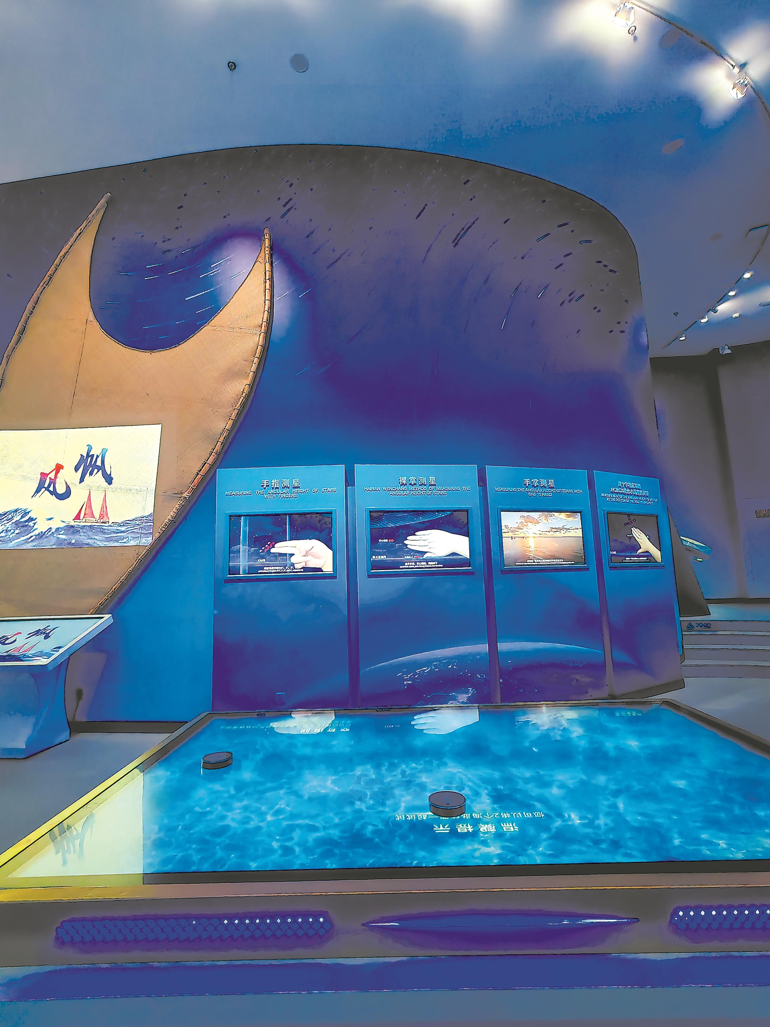 在“風好揚帆——南島語族航海術與文化”展廳的全息投影前,只要駐足于互動區域,屏幕里的先民就會“動”起來,只見他們駕著一艘艘獨木舟揚帆起航,踏上探索新家園的冒險旅途——