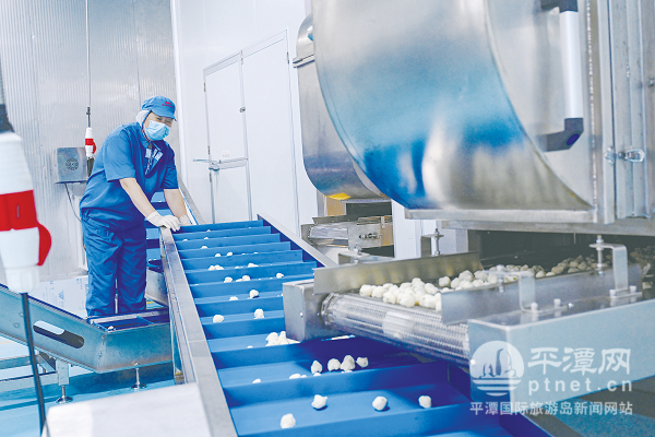自動化的生產線上加工出一顆顆白色的魚丸。