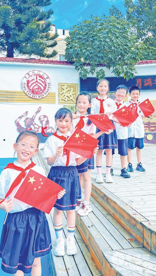 平潭北門小學揮舞五星紅旗,表達對祖國的美好祝福。