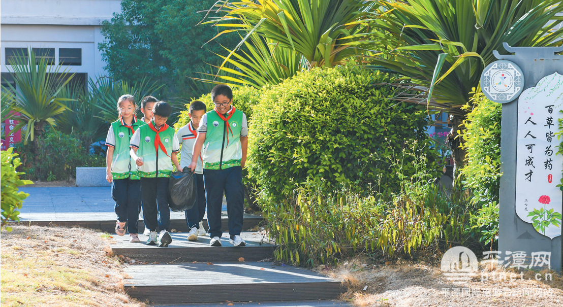 在平潭麒麟小學,少先隊員們一起打掃校園內的“百草園”。