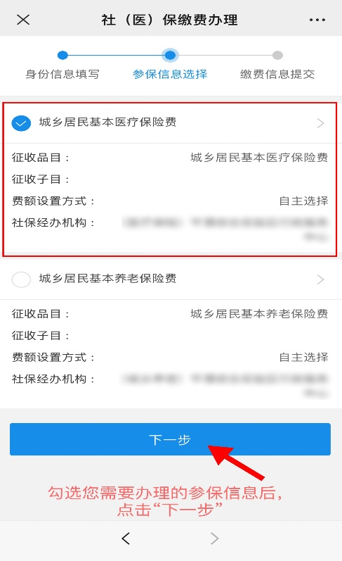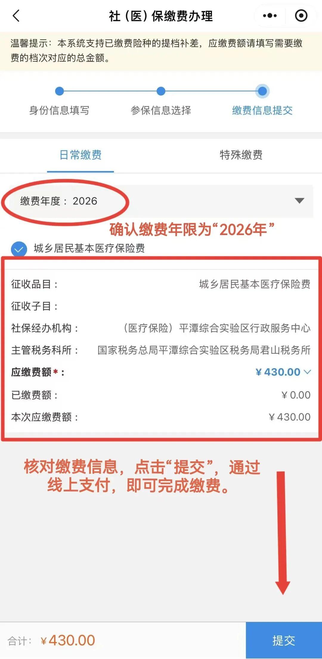 (2)參保信息選擇“城鄉居民基本醫療保險費”,點擊“下一步”。若辦理正常身份人員繳費業務,請在“日常繳費”頁面進行提交;若辦理特殊身份人員繳費業務,請在“特殊繳費”頁面進行提交。核對信息無誤后,點擊提交,選擇所需的支付方式后完成繳費。