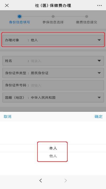 (1)掃碼跳轉至“閩政通”APP中“閩捷辦”頁面,點擊“個人參保繳費服務”,進入“個人社(醫)保繳費辦理頁面”,選擇辦理對象,為“本人”或“他人”辦理,輸入證件號碼和姓名,身份信息確認無誤后,點擊“下一步”。