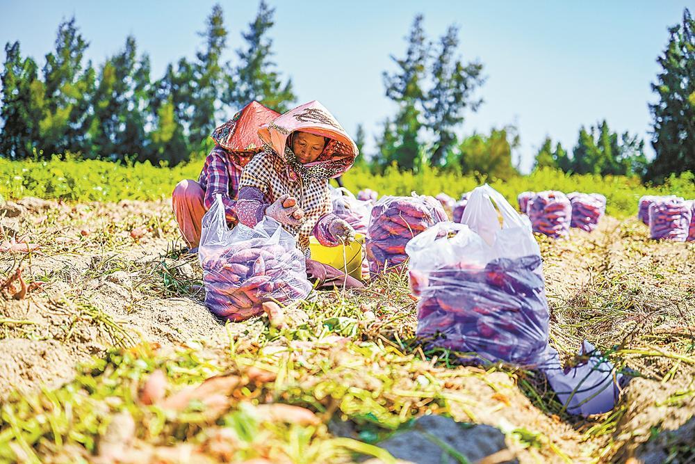 在幸福洋四期鹽堿地上,農戶忙著收獲甘薯。 林君斌 攝
