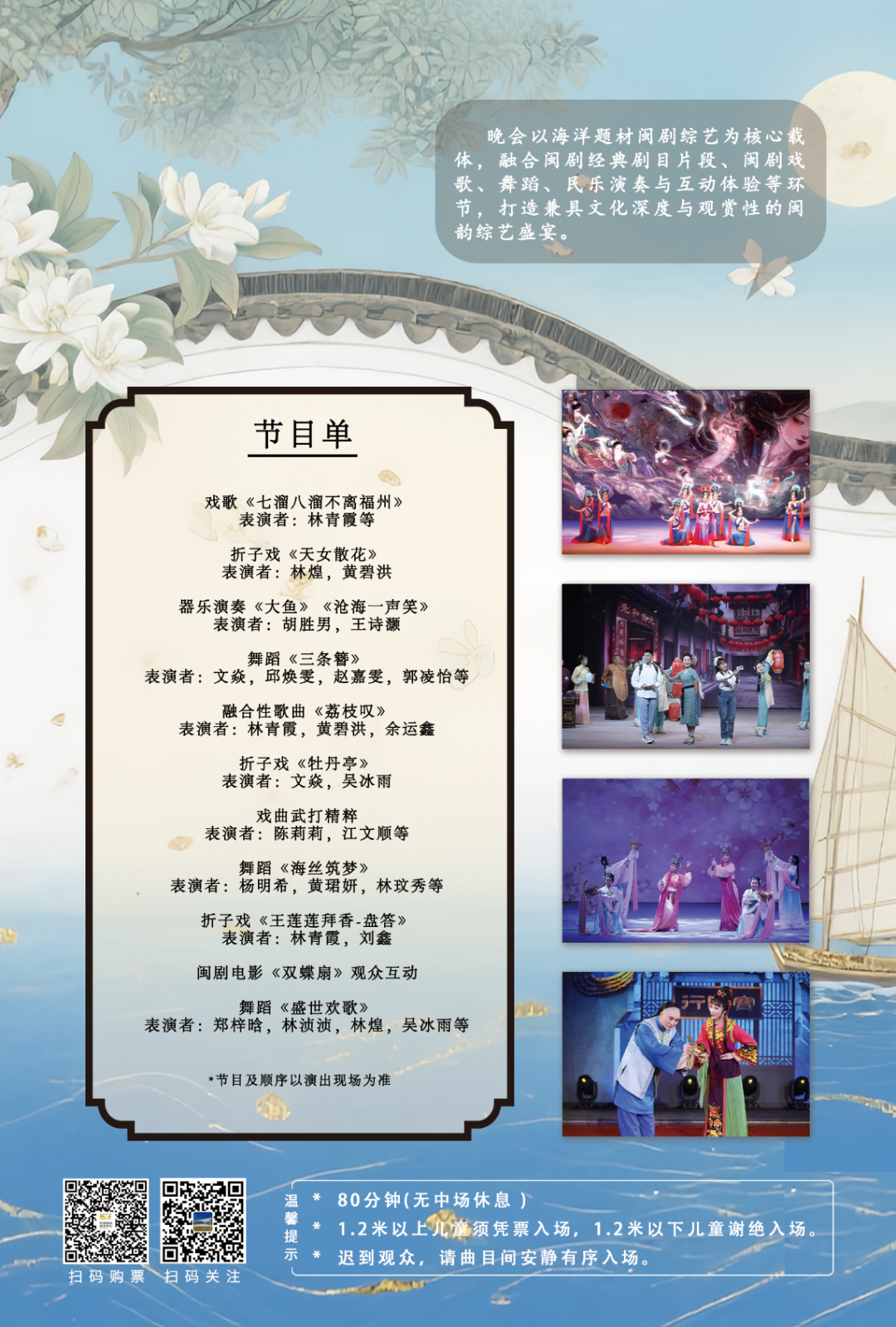晚會以海洋題材閩劇綜藝為核心載體,融合閩劇經典劇目片段、閩劇戲歌、舞蹈、民樂演奏及互動體驗等環節,打造出兼具文化深度與觀賞性的閩韻綜藝盛宴。