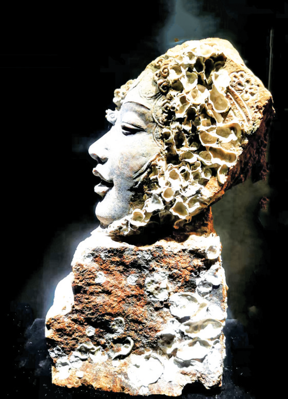 “這是我的第一件貝石作品,極具巧思。”在而華居,記者看到了《人生如戲——青衣·海韻》,那是一塊半面平滑,半面全是貝殼的貝石。鄭而華沒有改變石頭本身的輪廓,而是順勢而為:在石面平坦處,精雕出一位戲曲花旦清秀的側面容顏,她眉眼低垂,唇角含著一絲若有若無的微笑,韻味悠長。而那另一半天然隆起、密布著牡蠣殼的部分則被完整保留,它們恰如花旦頭上層層疊疊、珠翠點綴的發飾,渾然天成。