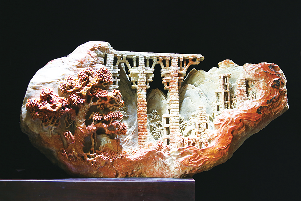 鄭而華從事壽山石雕刻藝術創作二十余年,在而華居里,一件名為《飲水思源》的石雕作品引人關注。石料本身粗獷,卻被巧妙化為平潭舊時水渠歷經風霜的古樸肌理,那紅白相間的部分如神來之筆,蜿蜒成水渠的渠身,像是一條被時光浸染出的血脈。