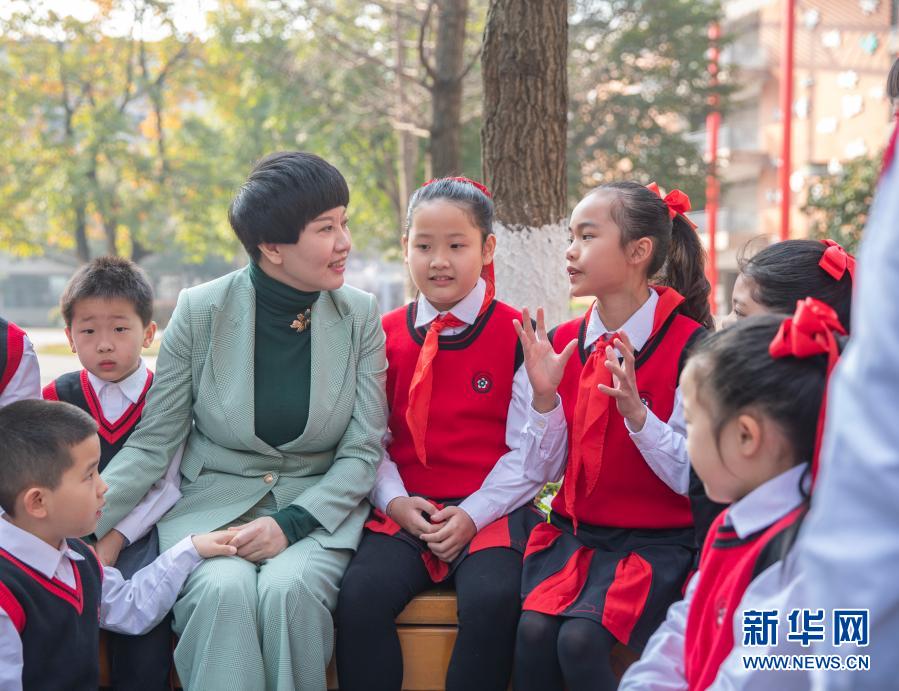 2月21日,在重慶市九龍坡區謝家灣小學,劉希婭(左三)在校園內與學生們聊天。新華社記者 黃偉 攝
