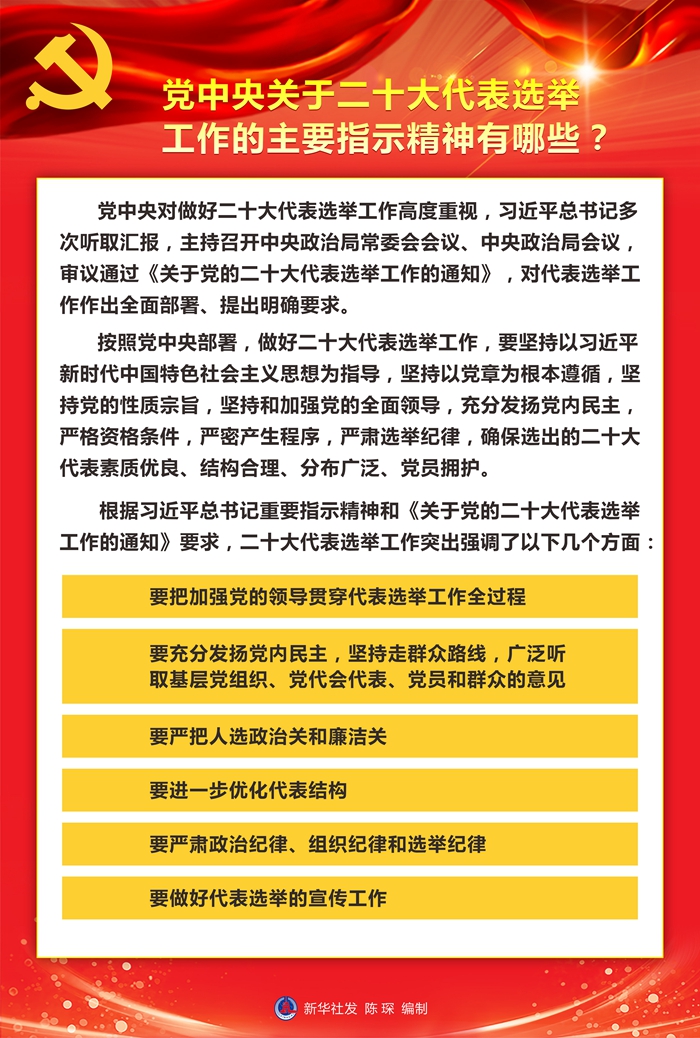 根據(jù)習(xí)近平總書記重要指示精神和《通知》要求,二十大代表選舉工作突出強(qiáng)調(diào)了以下幾個方面:要把加強(qiáng)黨的領(lǐng)導(dǎo)貫穿代表選舉工作全過程。旗幟鮮明、理直氣壯加強(qiáng)黨對代表選舉工作的領(lǐng)導(dǎo),推薦提名、組織考察、確定人選、會議選舉等各個環(huán)節(jié),都要切實發(fā)揮黨組織領(lǐng)導(dǎo)和把關(guān)作用。要充分發(fā)揚(yáng)黨內(nèi)民主,堅持走群眾路線,廣泛聽取基層黨組織、黨代會代表、黨員和群眾的意見。要嚴(yán)把人選政治關(guān)和廉潔關(guān)。堅持把政治標(biāo)準(zhǔn)放在首位,最重要的是政治堅定、對黨忠誠,堅決維護(hù)黨中央權(quán)威和集中統(tǒng)一領(lǐng)導(dǎo),在思想上政治上行動上同黨中央保持高度一致。加強(qiáng)政治素質(zhì)考察,看人選的政治判斷力、政治領(lǐng)悟力、政治執(zhí)行力,增強(qiáng)“四個意識”、堅定“四個自信”、做到“兩個維護(hù)”等方面表現(xiàn)情況,確保政治上過硬。把牢廉潔底線,認(rèn)真落實“四必”要求,不能把有硬傷、暗傷的人選進(jìn)來。要進(jìn)一步優(yōu)化代表結(jié)構(gòu)。充分體現(xiàn)黨的性質(zhì)宗旨,體現(xiàn)先進(jìn)性和廣泛代表性,要有各條戰(zhàn)線、各方面的代表。注重推薦工人、農(nóng)民和專業(yè)技術(shù)人員黨員中的先進(jìn)模范人物作為代表人選。嚴(yán)把人選身份關(guān),準(zhǔn)確認(rèn)定身份。生產(chǎn)和工作第一線代表比例,既要保證,也不能泛化。要嚴(yán)肅政治紀(jì)律、組織紀(jì)律和選舉紀(jì)律。堅持教育在先、警示在先、預(yù)防在先,始終把紀(jì)律和規(guī)矩挺在前面,深刻汲取湖南衡陽、四川南充、遼寧等地拉票賄選、破壞選舉案件教訓(xùn),舉一反三、引以為戒。加大監(jiān)督、查處和問責(zé)力度,對拉票賄選、說情打招呼、破壞選舉等違紀(jì)違法行為,發(fā)現(xiàn)一起、查處一起。對風(fēng)氣不正、查處不力、造成惡劣影響的,要嚴(yán)肅追究相關(guān)黨組織和領(lǐng)導(dǎo)干部的責(zé)任。要做好代表選舉的宣傳工作。堅持正確輿論方向,堅持團(tuán)結(jié)穩(wěn)定鼓勁、正面宣傳為主,營造良好輿論氛圍。
