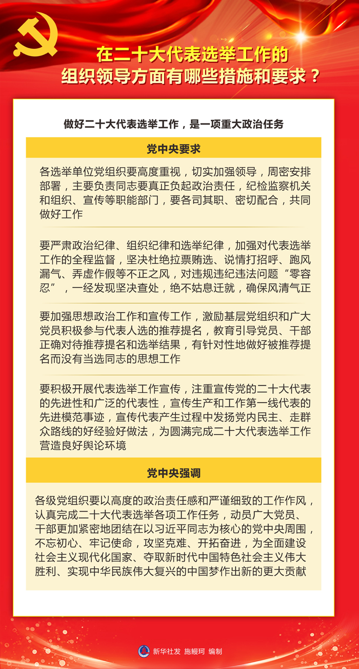 答:做好二十大代表選舉工作,是一項重大政治任務(wù)。黨中央要求,各選舉單位黨組織要高度重視,切實加強(qiáng)領(lǐng)導(dǎo),周密安排部署,主要負(fù)責(zé)同志要真正負(fù)起政治責(zé)任,紀(jì)檢監(jiān)察機(jī)關(guān)和組織、宣傳等職能部門,要各司其職、密切配合,共同做好工作。要嚴(yán)肅政治紀(jì)律、組織紀(jì)律和選舉紀(jì)律,加強(qiáng)對代表選舉工作的全程監(jiān)督,堅決杜絕拉票賄選、說情打招呼、跑風(fēng)漏氣、弄虛作假等不正之風(fēng),對違規(guī)違紀(jì)違法問題“零容忍”,一經(jīng)發(fā)現(xiàn)堅決查處,絕不姑息遷就,確保風(fēng)清氣正。要加強(qiáng)思想政治工作和宣傳工作,激勵基層黨組織和廣大黨員積極參與代表人選的推薦提名,教育引導(dǎo)黨員、干部正確對待推薦提名和選舉結(jié)果,有針對性地做好被推薦提名而沒有當(dāng)選同志的思想工作。要積極開展代表選舉工作宣傳,注重宣傳黨的二十大代表的先進(jìn)性和廣泛的代表性,宣傳生產(chǎn)和工作第一線代表的先進(jìn)模范事跡,宣傳代表產(chǎn)生過程中發(fā)揚(yáng)黨內(nèi)民主、走群眾路線的好經(jīng)驗好做法,為圓滿完成二十大代表選舉工作營造良好輿論環(huán)境。