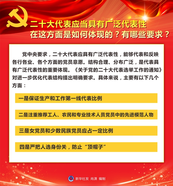 問:二十大代表肩負(fù)著全黨9500多萬名黨員的重托和期望,應(yīng)當(dāng)具有廣泛代表性,請問在這方面是如何體現(xiàn)的?有哪些要求?