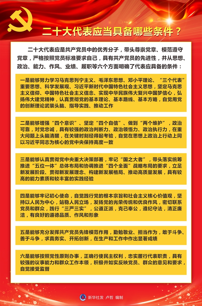 問:按照黨中央要求,二十大代表要嚴(yán)格資格條件,堅持把政治標(biāo)準(zhǔn)放在首位,請問具體應(yīng)當(dāng)具備哪些條件?