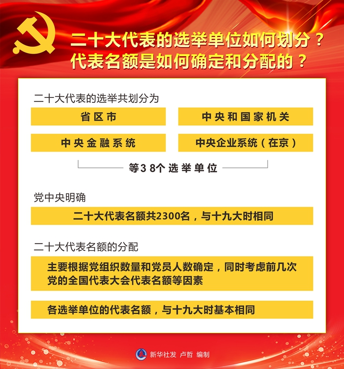 黨中央明確,二十大代表名額共2300名,與十九大時相同。二十大代表名額的分配,主要根據(jù)黨組織數(shù)量和黨員人數(shù)確定,同時考慮前幾次黨的全國代表大會代表名額等因素。按照這一分配辦法,各選舉單位的代表名額,與十九大時基本相同。按照慣例,黨中央將確定一部分已退出領(lǐng)導(dǎo)崗位的老黨員作為特邀代表出席大會。
