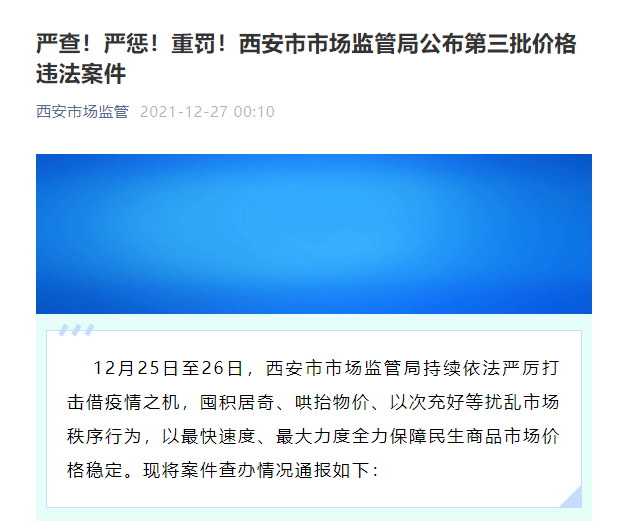 2021-12-27 16:35:26 來源:西安市場監管微信公眾號原標題:嚴查!嚴懲!重罰!西安市市場監管局公布第三批價格違法案件