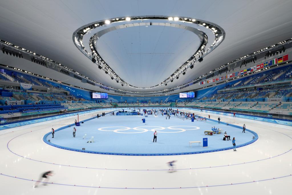 1月31日,北京冬奧會(huì)速度滑冰項(xiàng)目首場(chǎng)訓(xùn)練賽在國(guó)家速滑館“冰絲帶”舉行。新華社記者王菲攝