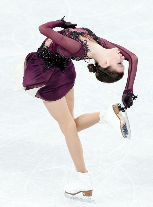 一席黑裙的特魯索娃倒數第四個出場,她成為第一位在冬奧會中完成五個四周跳的女選手,盡管有兩個四周跳完成得并不完美。最終,特魯索娃依靠這套技驚四座的表演獲得177.13分,并以251.73分的總成績獲得銀牌。