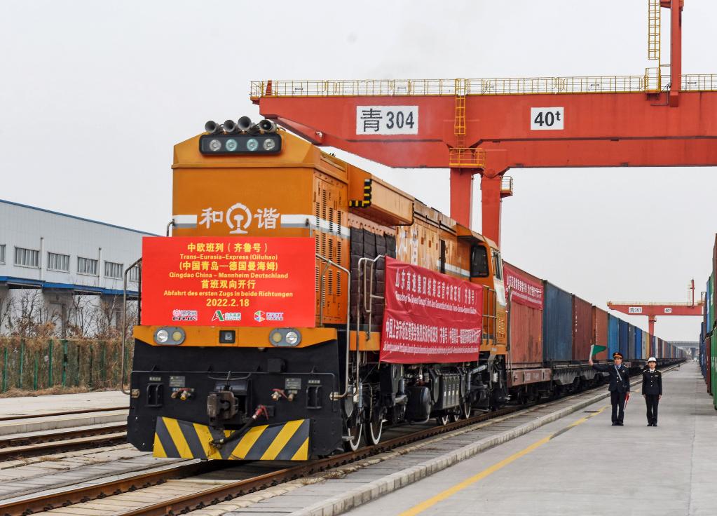 2月18日,中歐班列(齊魯號)中國青島—德國曼海姆雙向對開首班列車從上合示范區青島多式聯運中心出發。(新華社發,王昭脈攝)