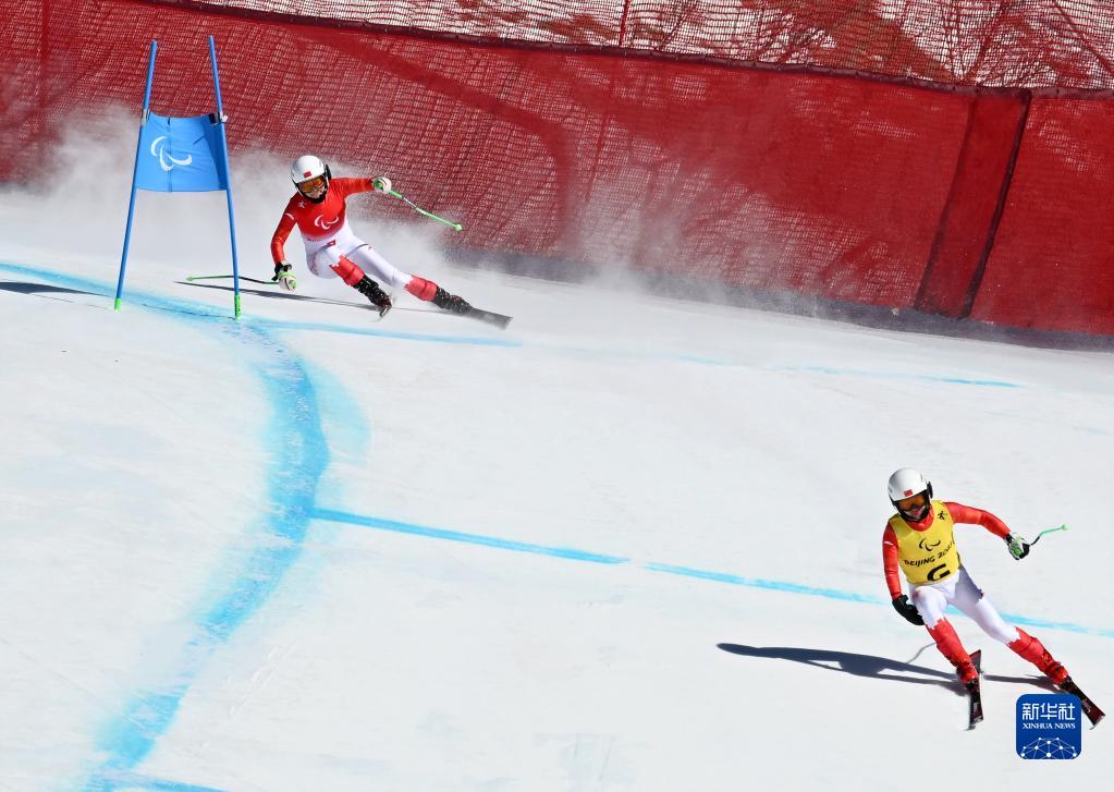 3月5日,中國選手朱大慶(左)與引導員閆寒寒在北京冬殘奧會高山滑雪項目女子滑降(視障)比賽中。她最終獲得亞軍。新華社記者張晨霖攝
