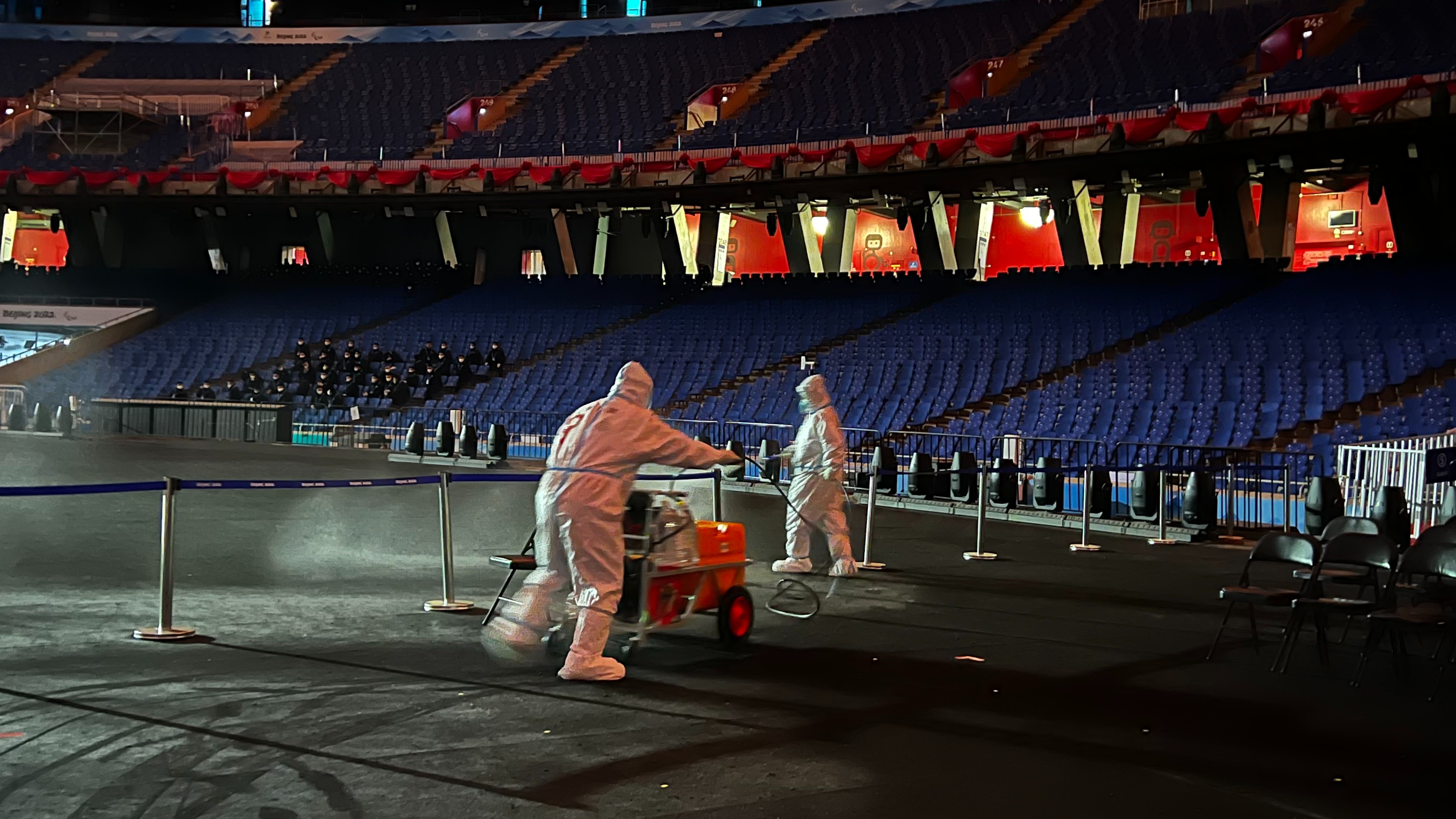 “有防范”——這是國家體育場公共衛生團隊的嚴謹所在。在奧密克戎和德爾塔毒株雙重夾擊下,日常檢測、定期排查、及時消殺成為關鍵。同時,組織專業消毒技術團隊每日重點對閉環內、外,集中辦公區、演員休息區等人員密集區域開展環境消毒,累積消毒155萬平方米,強化了冬奧防控的風險預警與排查。