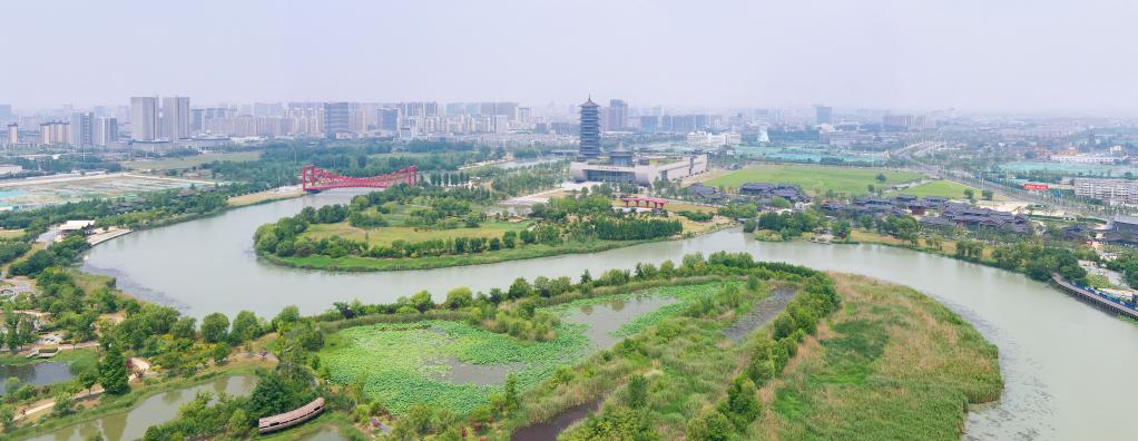 這是2022年5月25日拍攝的揚州市運河三灣景區(無人機照片)。新華社記者 李博 攝