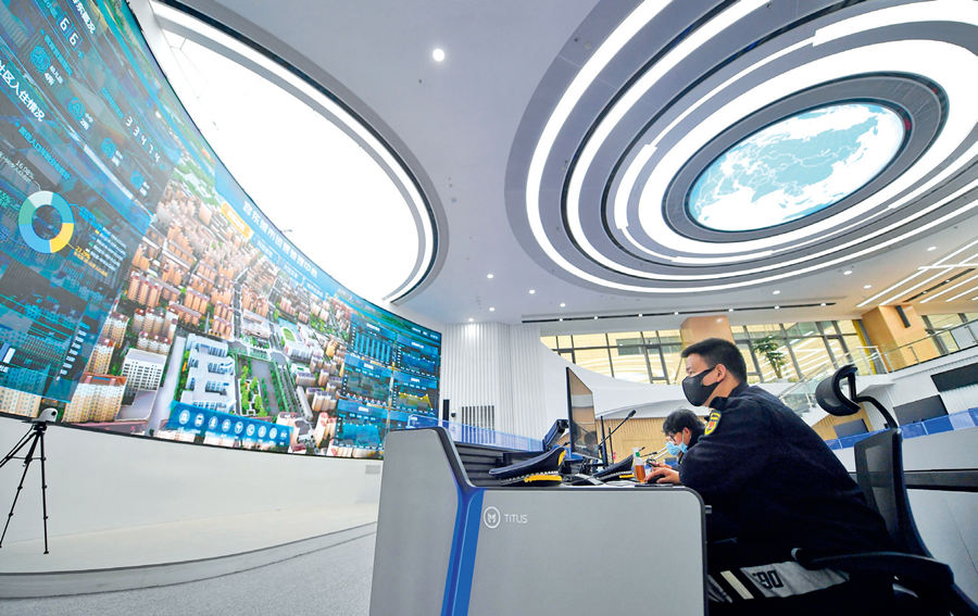 工作人員在雄安新區容東城市運營管理中心監管平臺工作(2022年3月29日攝) 朱旭東攝/《瞭望》新聞周刊