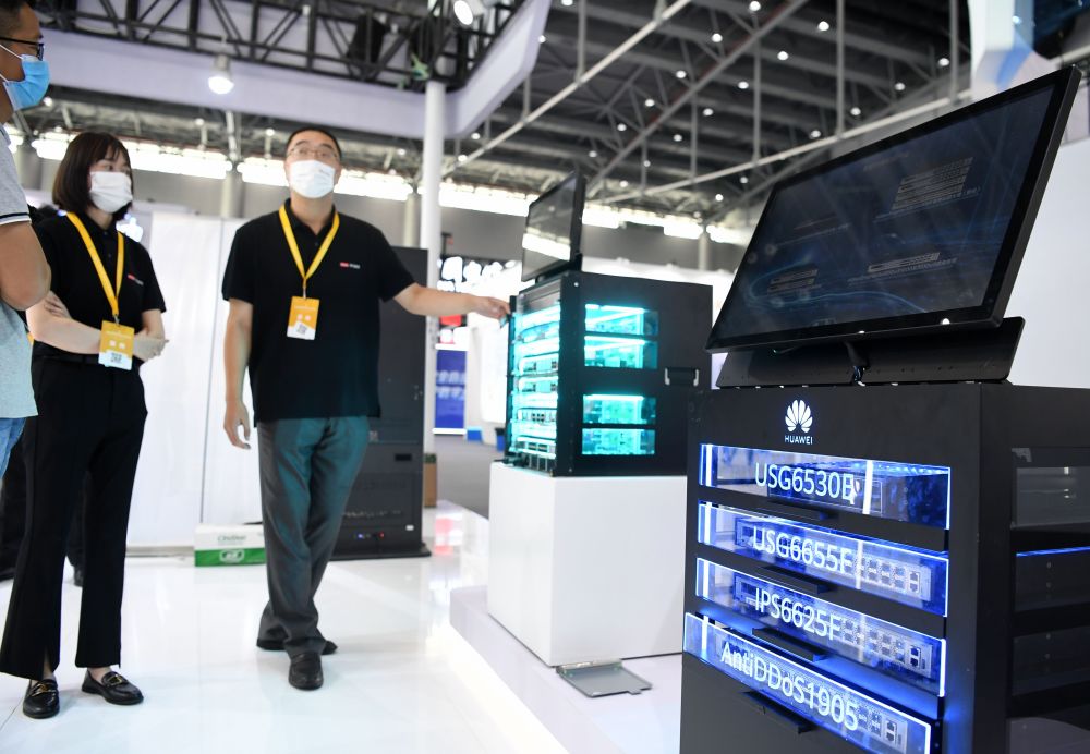 ↑9月4日,一家參展企業代表在介紹防火墻產品。
