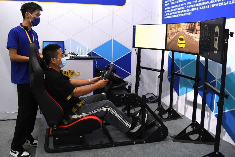 ↑9月4日,一家參展企業代表在演示使用車載網絡安全科技產品。