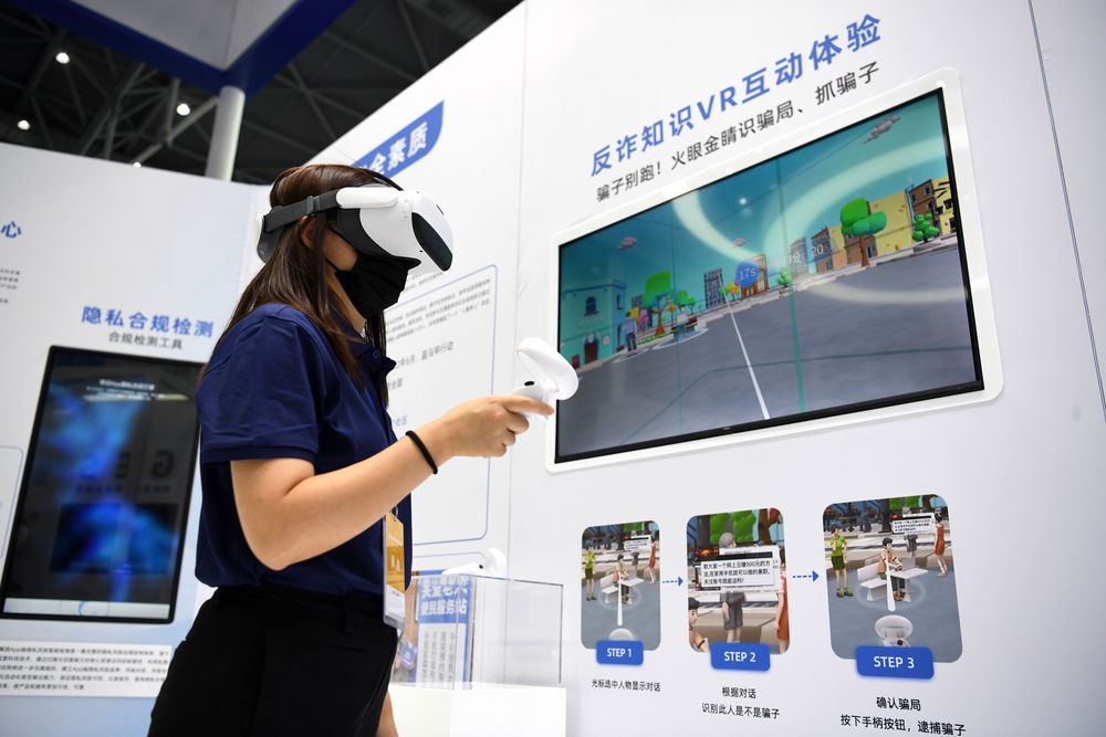 ↑9月4日,一家參展企業代表在演示反詐知識VR互動體驗項目。