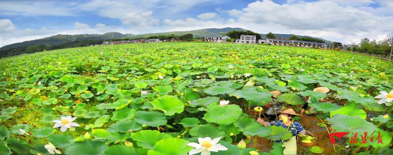 在建寧縣濉溪鎮(zhèn)謝馬蘇梯田蓮海,蓮農(nóng)正在荷塘里采蓮蓬。 福建日報記者 林輝 攝