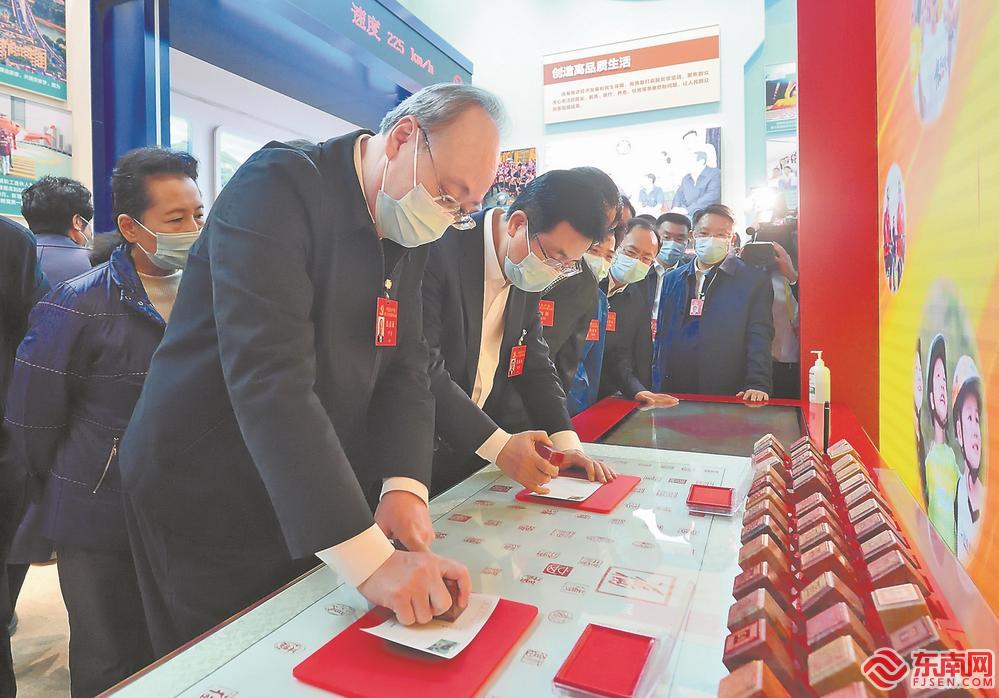 墻上大幅圖片是2014年11月習近平總書記來到福州軍門社區調研時拍攝的,林丹代表興奮地與大家分享當時的情景,共同感受習近平總書記濃濃的人民情懷。林占熺代表看到墻上自己當年為閩寧鎮村民講解巨菌草種植知識的照片,露出開心的笑容。項忠紅代表望著下黨鄉美麗風光的圖片,十分自豪,連聲說要拍下來帶回去與鄉親們分享。在“福見百業”互動體驗區,大家興致勃勃地用不同的印章在福建風光特色明信片上拓“福”、造“福”!