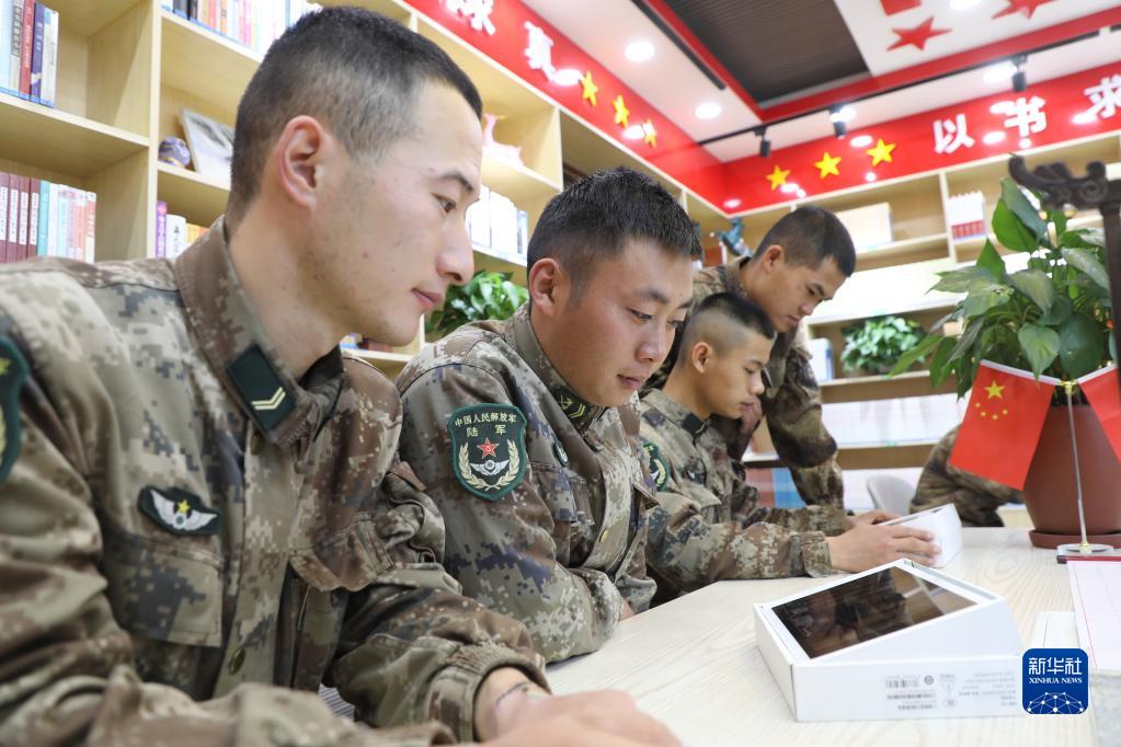 中共中央總書記、國家主席、中央軍委主席習近平24日下午出席軍隊領導干部會議時發表的重要講話,在解放軍和武警部隊引起強烈反響。這是新疆軍區奧爾托蘇邊防連官兵在圖書室認真學習習主席重要講話(10月25日攝)。新華社發(劉南松 攝)