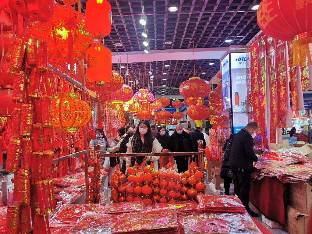 “老板,這個福字多少錢?”“今年有什么新樣式?”“這種對聯還有庫存嗎?來50套?!毙〉昀?,有前來進貨的商販,也有逛街采買的散客,新年裝飾品的燈光映在每個人臉上,洋溢著喜氣。