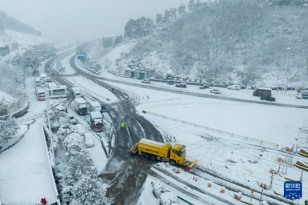 1月22日,在湖南省婁底市一高速收費站,除雪車在作業(無人機照片)。近日,受寒潮天氣影響,我國多地迎來降溫降雪天氣,各地積極組織相關部門開展抗凝除雪工作,保安全保暢通。新華社發(吳永華攝)