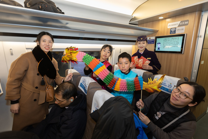 1月26日,旅客在G10次高鐵車廂內(nèi)舞動龍年裝飾。新華社記者 王翔 攝