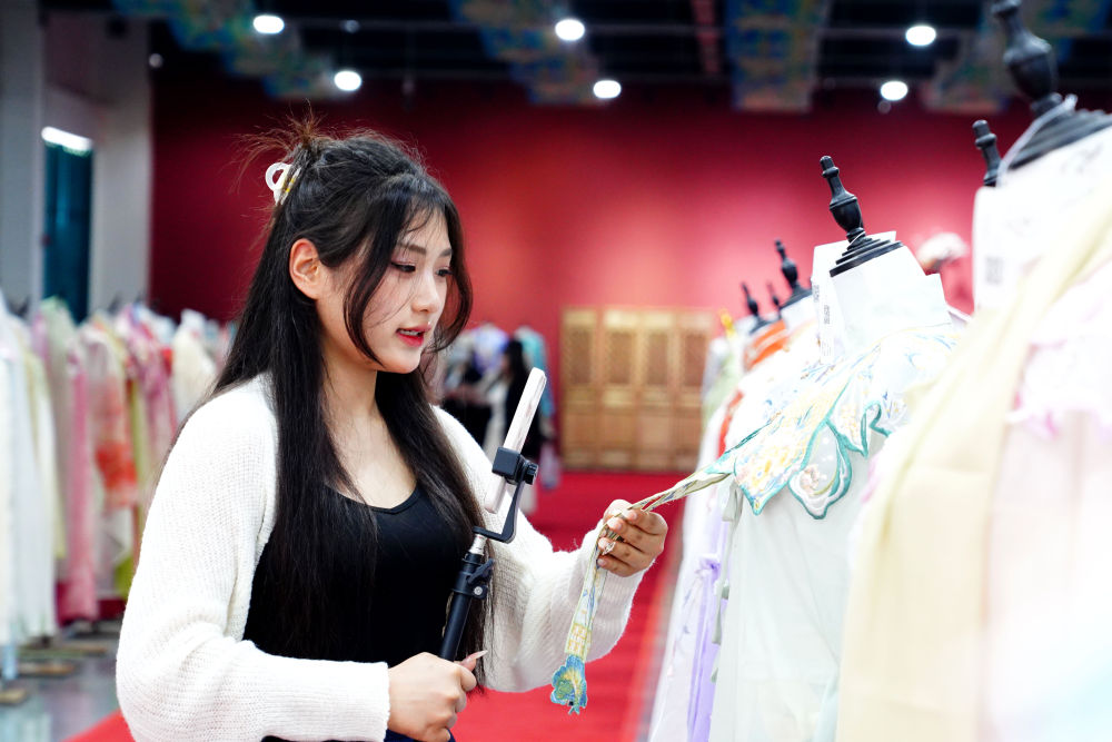 2024年4月13日,主播在山東省菏澤市曹縣有愛云倉(cāng)漢服基地直播推介漢服。新華社記者 郭緒雷 攝