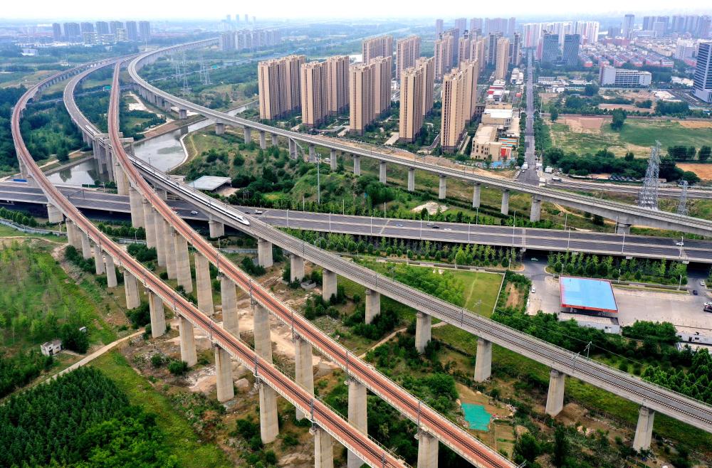 2024年5月30日,一列動車組列車行駛在鄭州東站附近的線路上。(新華社發)