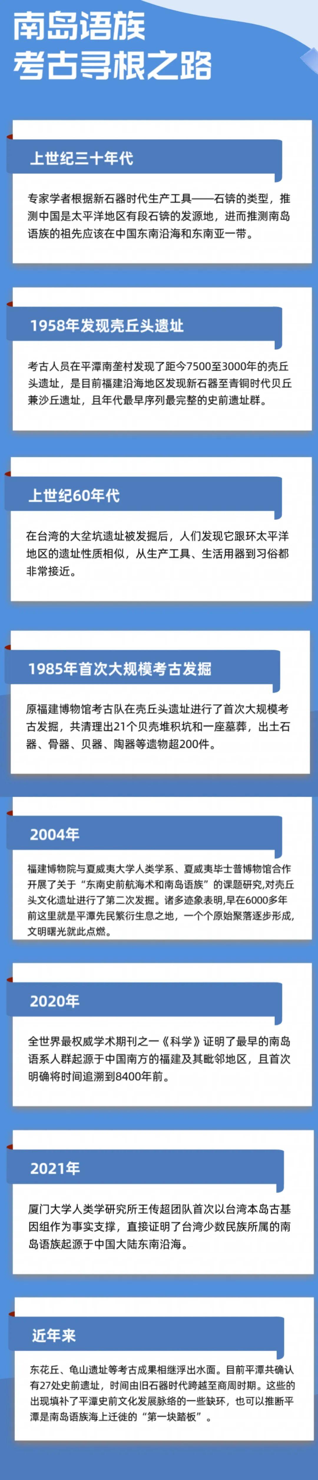 2021年,廈門大學人類學研究所王傳超團隊首次以臺灣本島古基因組作為事實支撐,直接證明了臺灣少數民族所屬的南島語族起源于中國大陸東南沿海。”