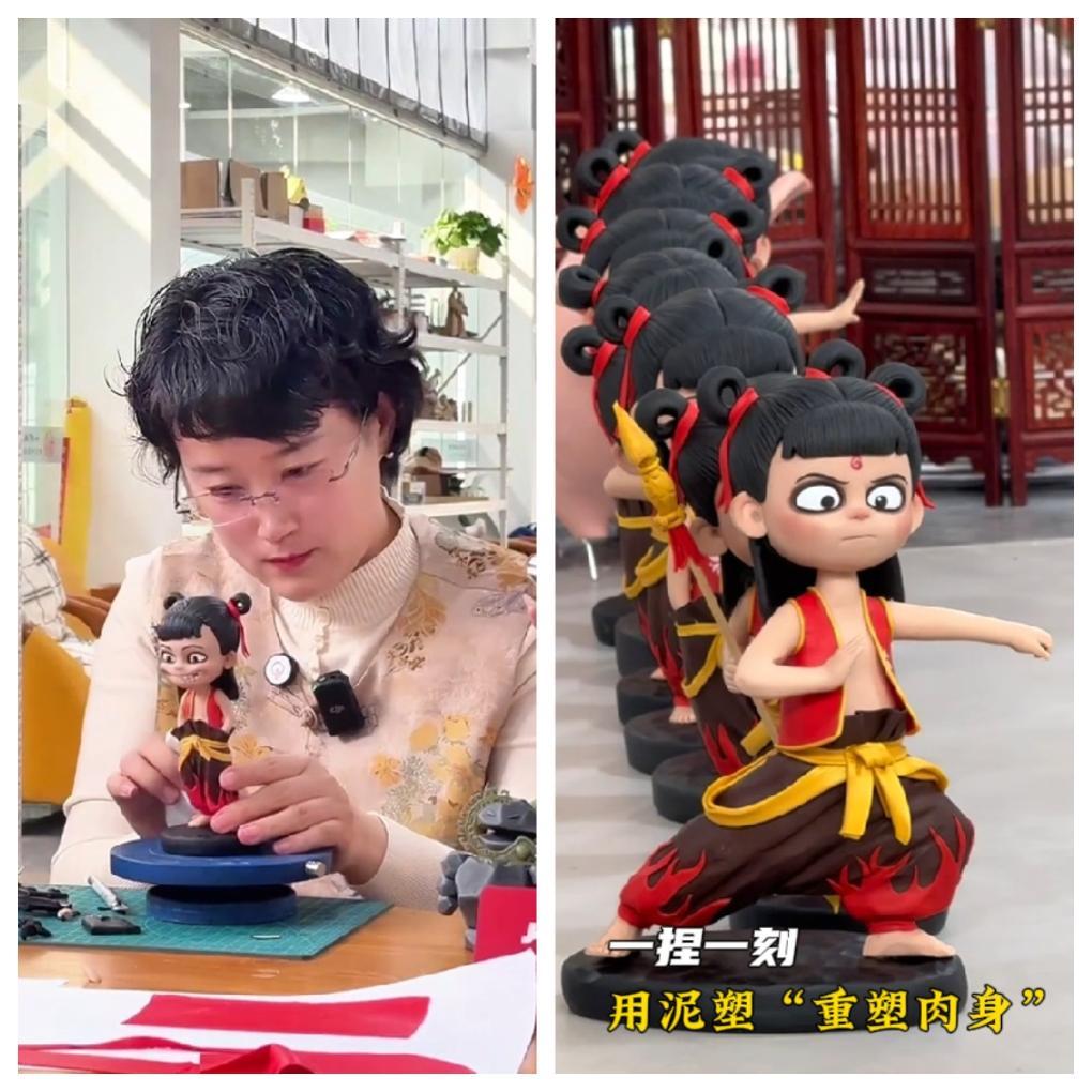 山東淄博的泥塑手工技藝人王枝在分享泥塑版“哪吒”的視頻中表示,“希望能夠用我們對(duì)手工的熱愛,來表達(dá)對(duì)國漫的支持,以及對(duì)國漫崛起的自豪感。”
