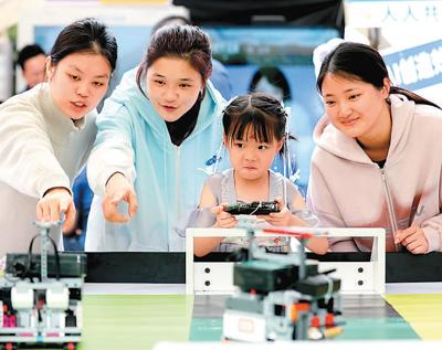 4月28日,在福建省福州市鼓樓區(qū)鼓東街道冶山春秋園,小朋友正在體驗足球機器人。謝貴明攝(人民視覺)