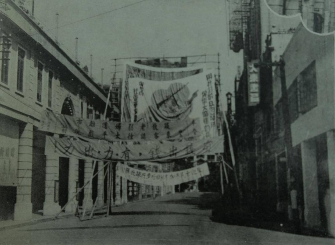 △廣東省廣州市,日軍拍攝到的抗戰標語:“有錢出錢,有力出力?!?/p>