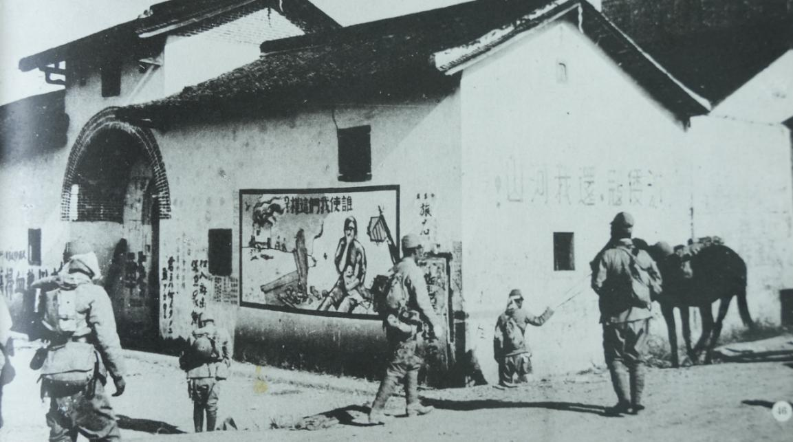 △廣東省韶關市翁源縣官渡鎮,日軍拍攝到的抗戰標語:“貢獻國家一升糧,就增抗戰一分力!”