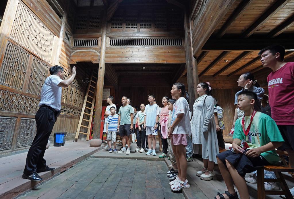 2025年8月1日,梅汝璈故居講解員梅庭軍(左一)向游客介紹梅汝璈。