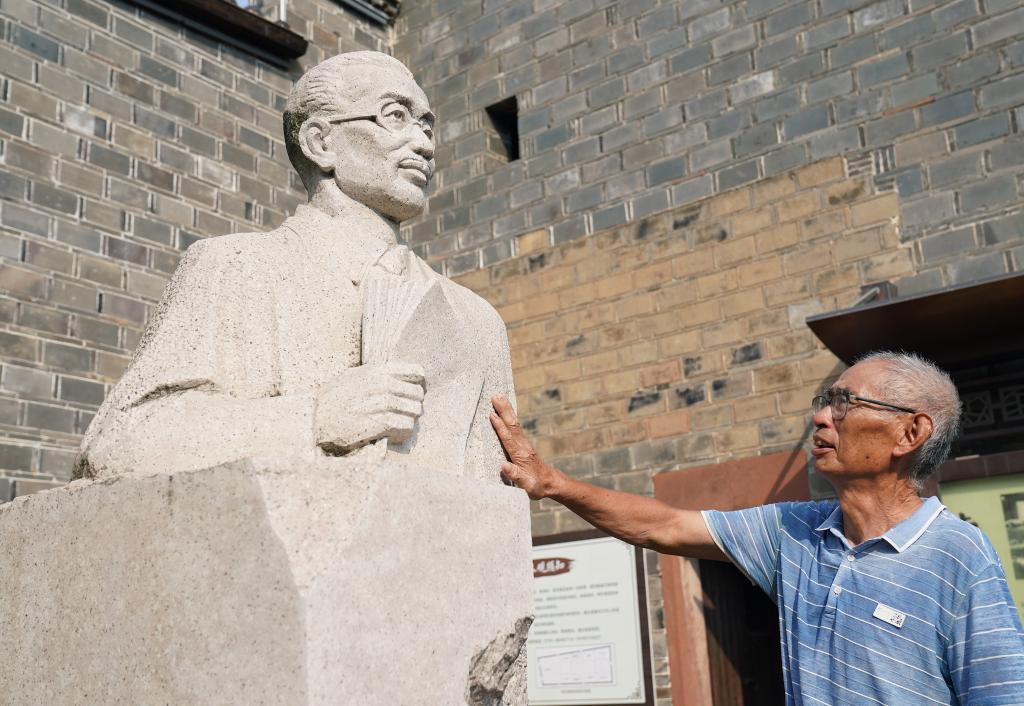 2025年8月1日,78歲的梅氏家族長(zhǎng)輩梅華林在梅汝璈故居院中瞻仰梅汝璈雕像。