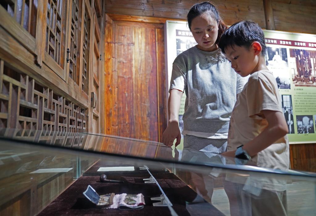 2025年8月1日,一名家長(zhǎng)(左)帶孩子在梅汝璈故居參觀梅汝璈在東京審判時(shí)期用過(guò)的物品。